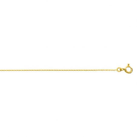 Deze 9-karaats gouden ketting is een kabelschakelketting die verkrijgbaar is in verschillende lengtes en een breedte van 0,85 mm heeft.