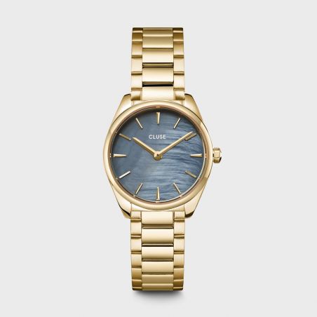 Het kleinste model uit onze best verkochte Fierce-collectie, maar toch uniek in zijn soort. Het CLUSE Féroce Mini-horloge combineert op harmonieuze wijze minimalisme en duidelijk gedefinieerde, verfijnde details. Met zijn ronde goudkleurige kast van 25 mm, zijn exclusieve blauwe parelmoer wijzerplaat en een 12 mm 3-schakels gouden armband is dit Féroce Mini horloge voor dames zeker een sensatie. Vergeet niet dat dit horloge een echte eyecatcher is die je een lawine aan flatterende reacties garandeert! De maat van de horlogeband verstel je eenvoudig zelf.