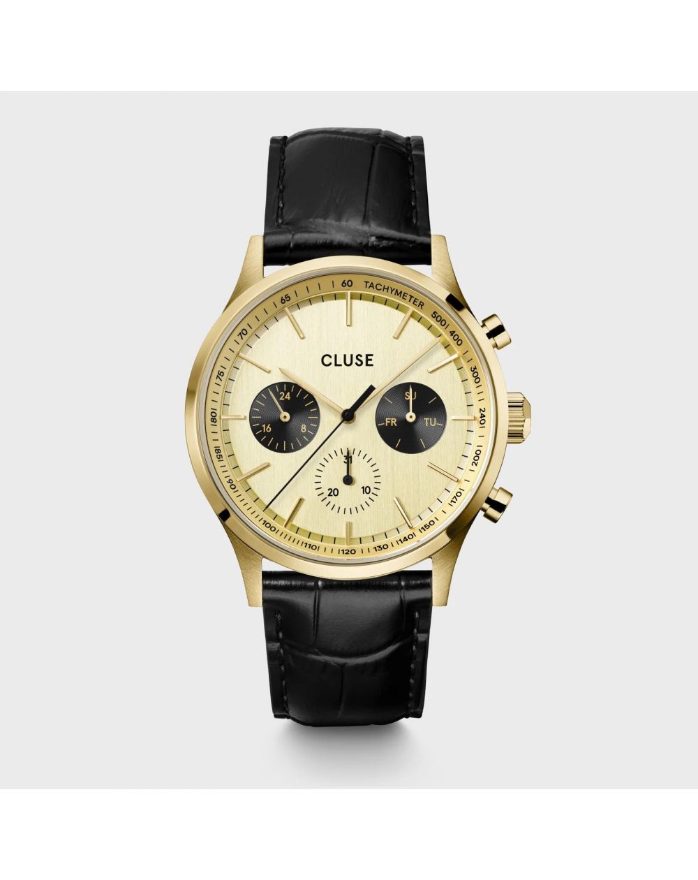 Wijzerplaat: Goudkleur met contrasterende zwarte subdials. Er zijn drie subwijzerplaten: één voor de 24-uursweergave, één voor de dagen van de week en één voor de seconden. De uurmarkeringen zijn gouden knuppels.