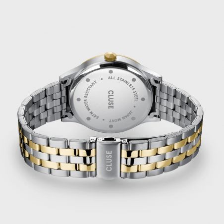 Armband : Tweekleurig roestvrij staal met afwisselend gepolijste en geborstelde schakels, vouwsluiting.