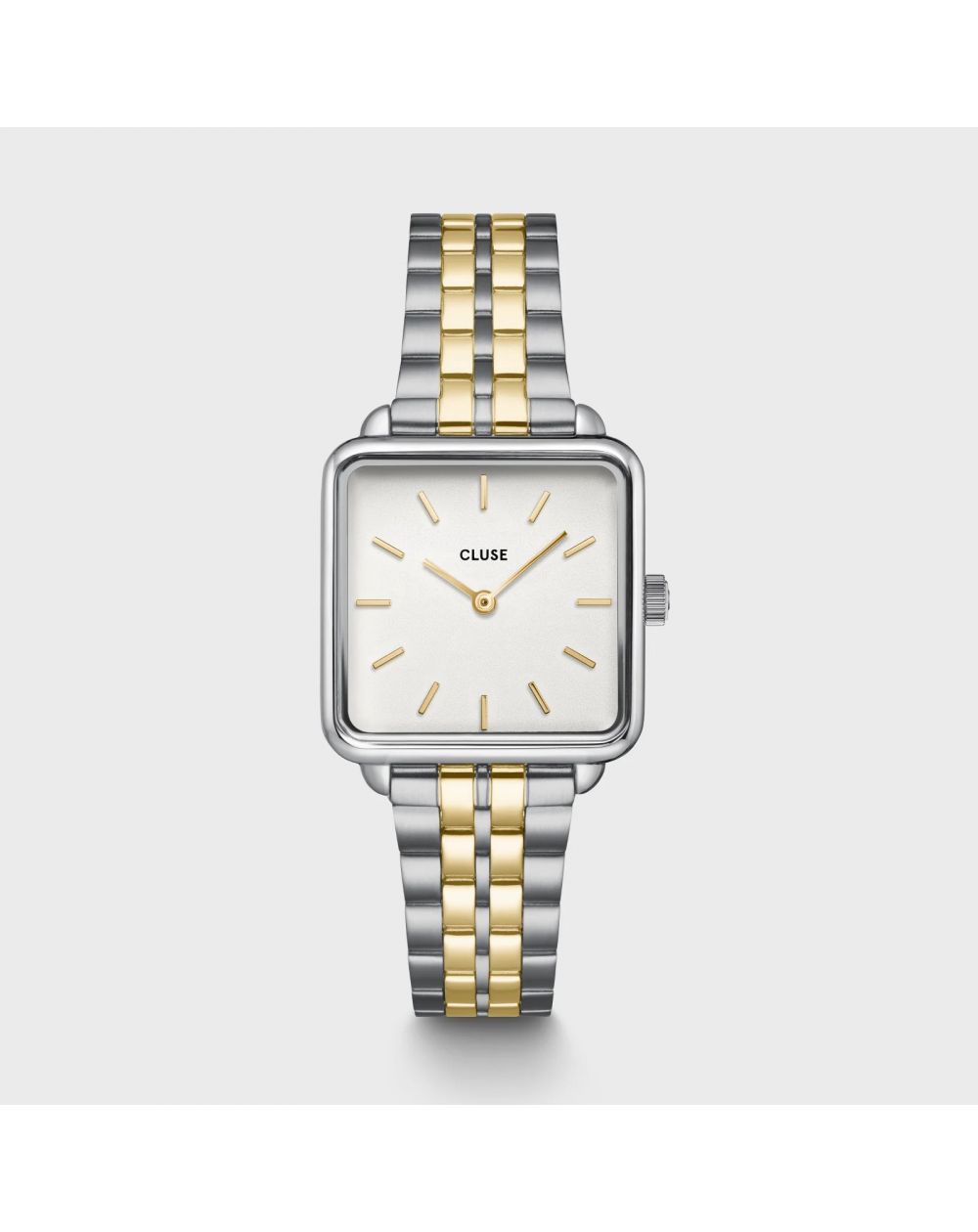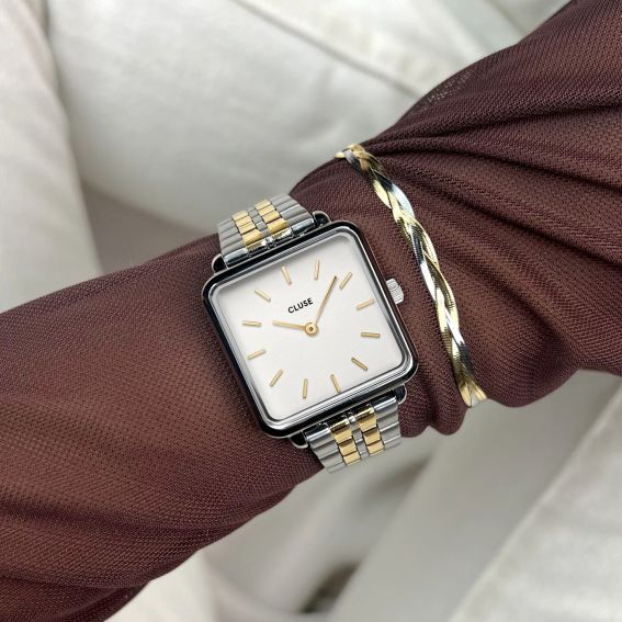 Voeg een vleugje luxe en verfijning toe aan je dagelijkse garderobe met het La Tétragone -horloge voor dames. Dit horloge heeft een elegante vierkante zilveren kast van 28,5 mm en wordt versterkt door een tweekleurige armband met 5 schakels die zilver- en goudtinten harmonieus combineert.