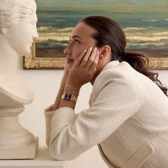 Het vierkante dameshorloge La Tétragone heeft een 28,5 mm gouden kast, een bordeauxrode wijzerplaat versierd met goudkleurige stenen en een 16 mm gouden roestvrijstalen band.
