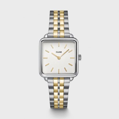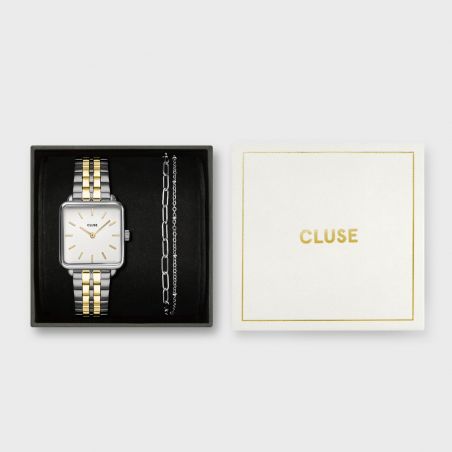 Deze CLUSE-geschenkset bevat een La Tétragone-horloge met een vierkante zilveren kast, een tweekleurige zilver/gouden stalen band en een witte wijzerplaat met gouden uurmarkeringen. Het wordt geleverd met een zilveren schakelband met fijne schakels.