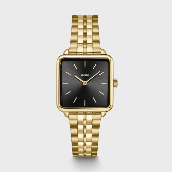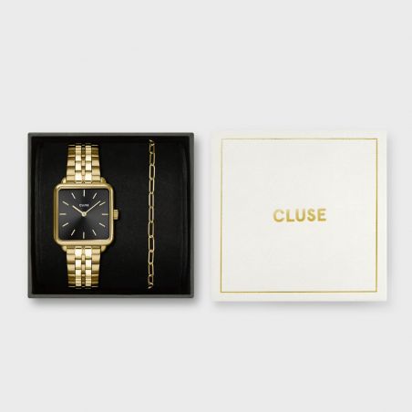 Deze CLUSE-geschenkset bevat een vierkant gouden horloge met een elegante zwarte wijzerplaat en een goudkleurige stalen band , samen met een bijpassende goudkleurige schakelband . Verpakt in een wit-gouden geschenkdoos, is het een chic en tijdloos cadeau.