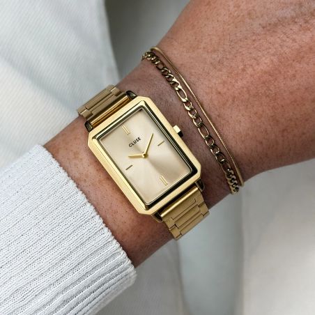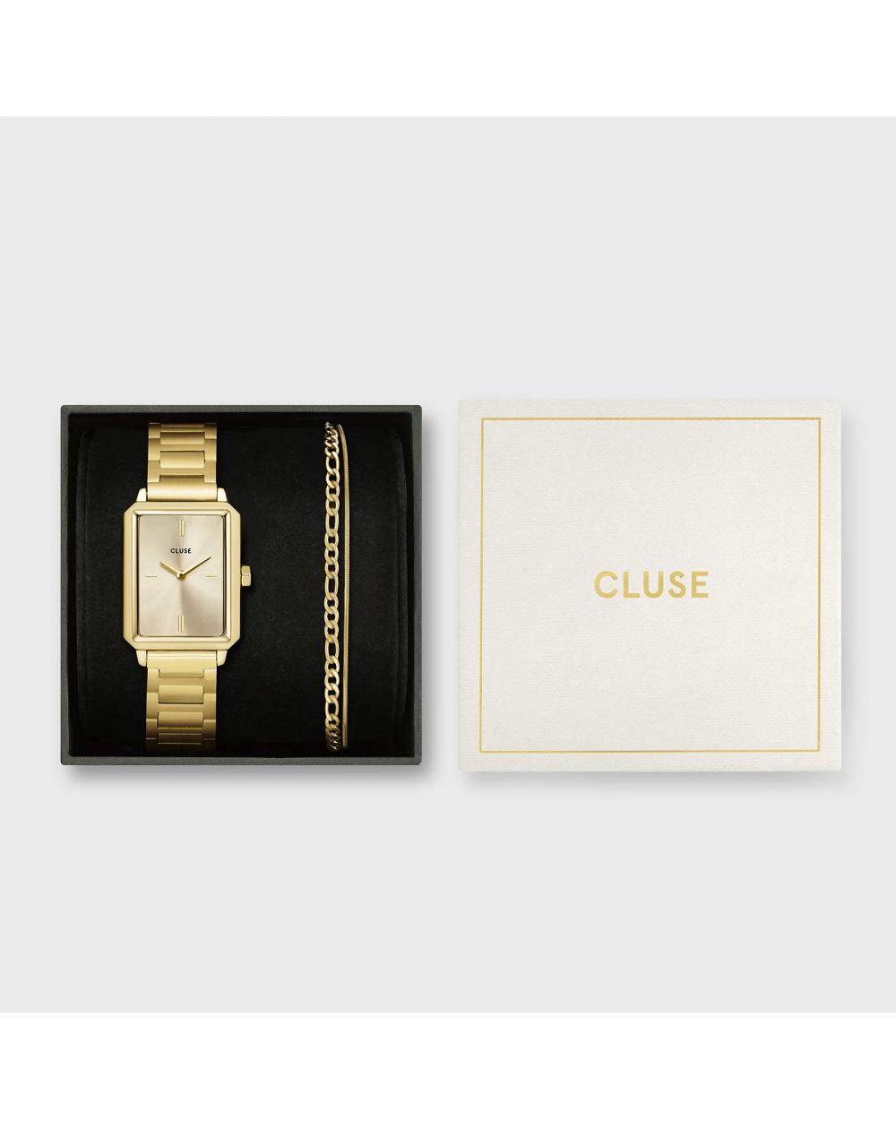 Verwen uzelf (of iemand anders) met een cadeau dat even chic als tijdloos is met deze CLUSE-box , bestaande uit een rechthoekig gouden horloge en een bijpassende schakelarmband .