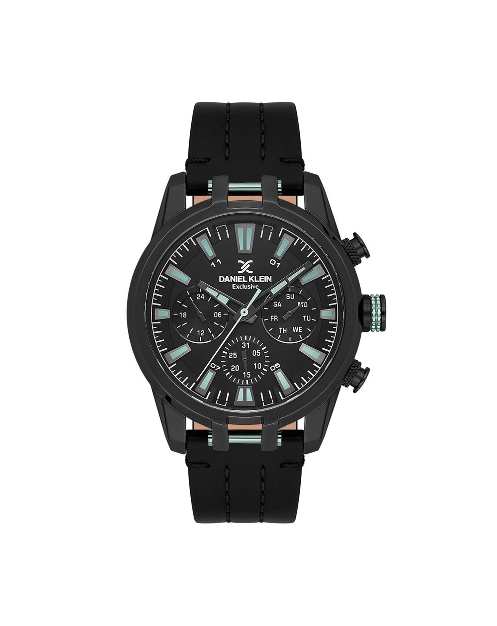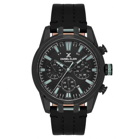 Daniel Klein DK.1.13803-5 multifunctioneel herenhorloge , een stoer exemplaar met een stevige zwarte kast en een strakke zwarte wijzerplaat versterkt met mintgroene lichtgevende details. De zwarte leren band voegt een klassiek en comfortabel tintje toe. Met meerdere functies, waaronder dag, datum en een chronograaf, combineert dit horloge stijl en prestaties voor de moderne man. Bestel nu!