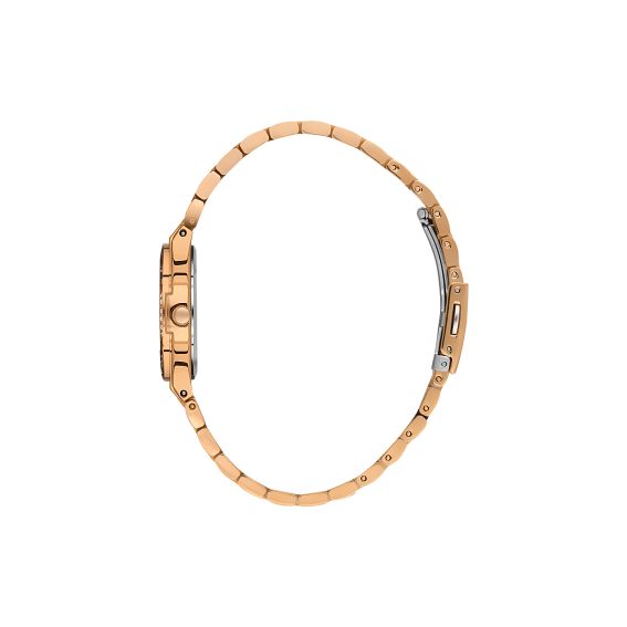 De roségouden roestvrijstalen armband zorgt voor een stralende en warme afwerking en is tegelijkertijd duurzaam en comfortabel. Het strakke ontwerp maakt het een tijdloos horloge dat gemakkelijk te combineren is met al je outfits, van casual tot chic.