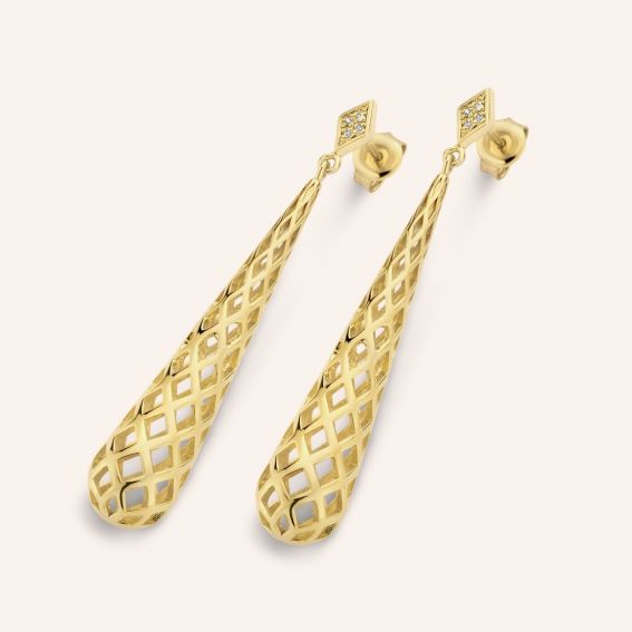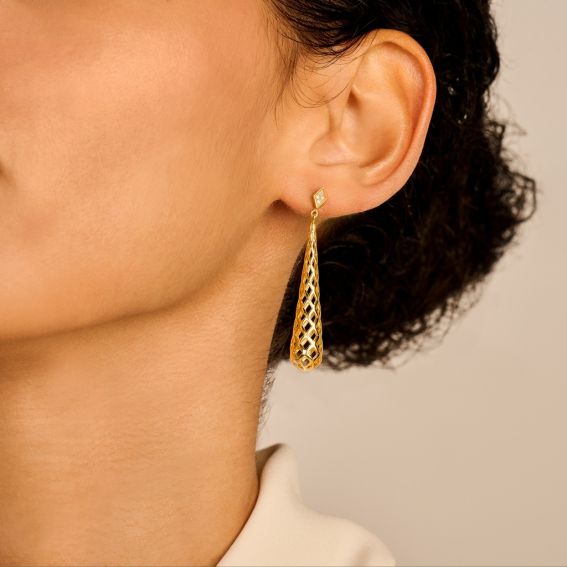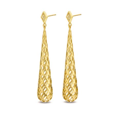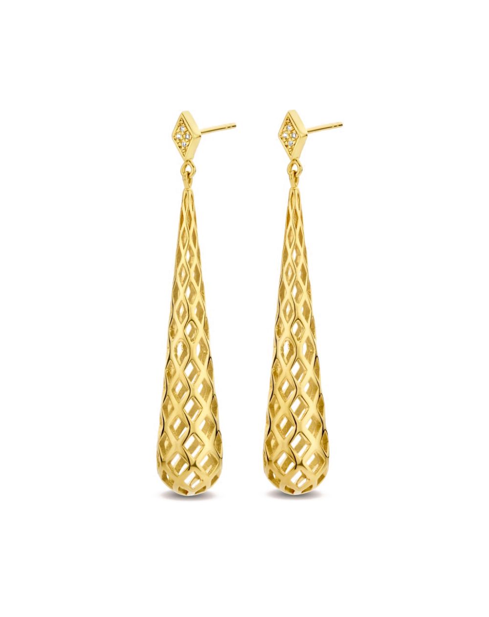 Deze Diamanti Per Tutti-oorbellen zijn kegelvormige boren gedefinieerd door een ingewikkeld honingraatpatroon, op een diamanten diamanten oorbel bezet met 8 sprankelende echte diamanten .
