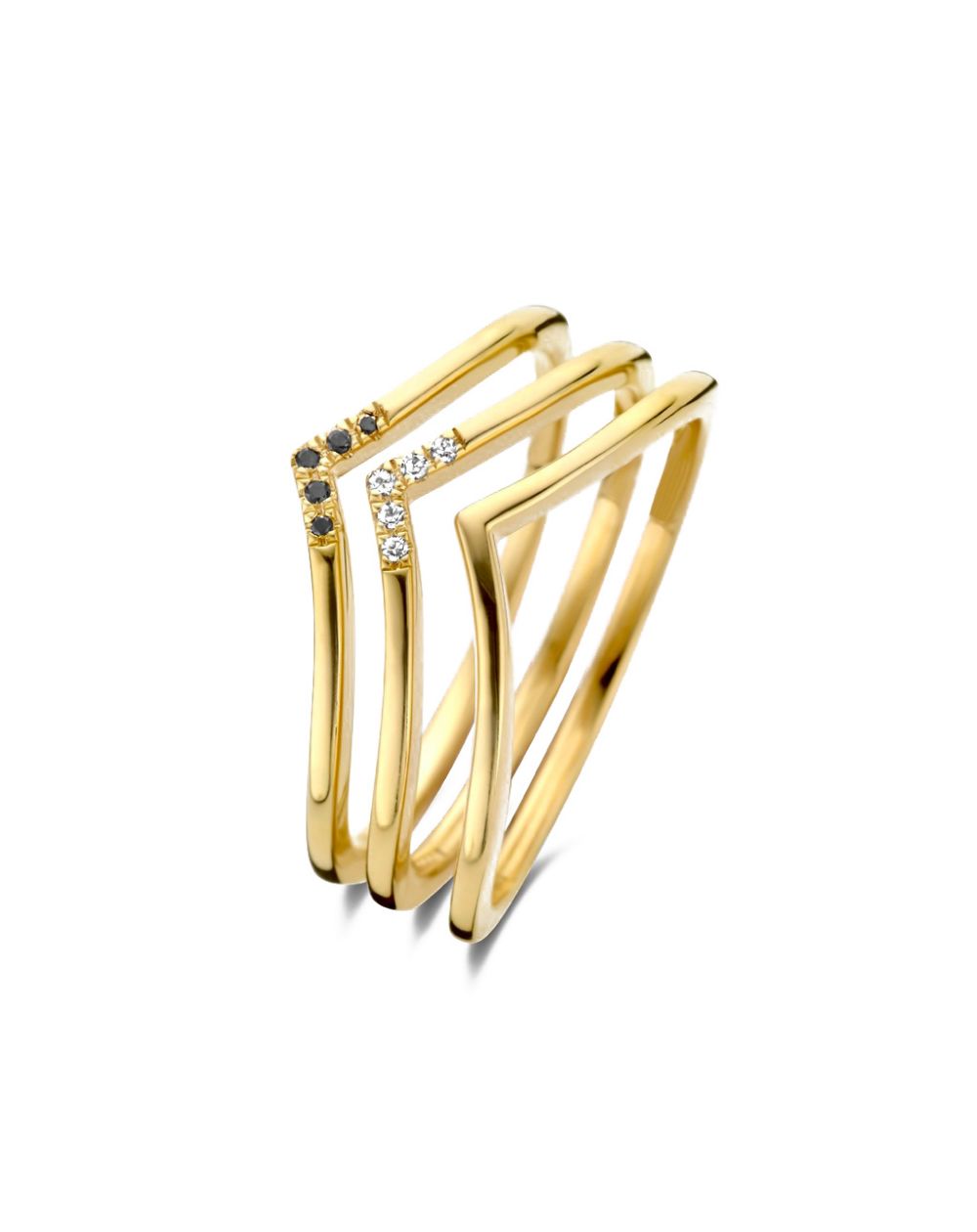 Dit trio veelzijdige ringen van het merk Diamanti Per Tutti bestaat uit 3 ringen om te combineren. Eén is bezet met 5 natuurlijke diamanten, de andere met 5 onyxstenen en de laatste is effen zonder stenen.