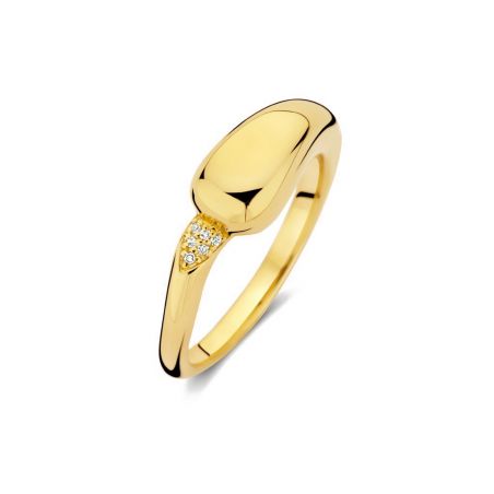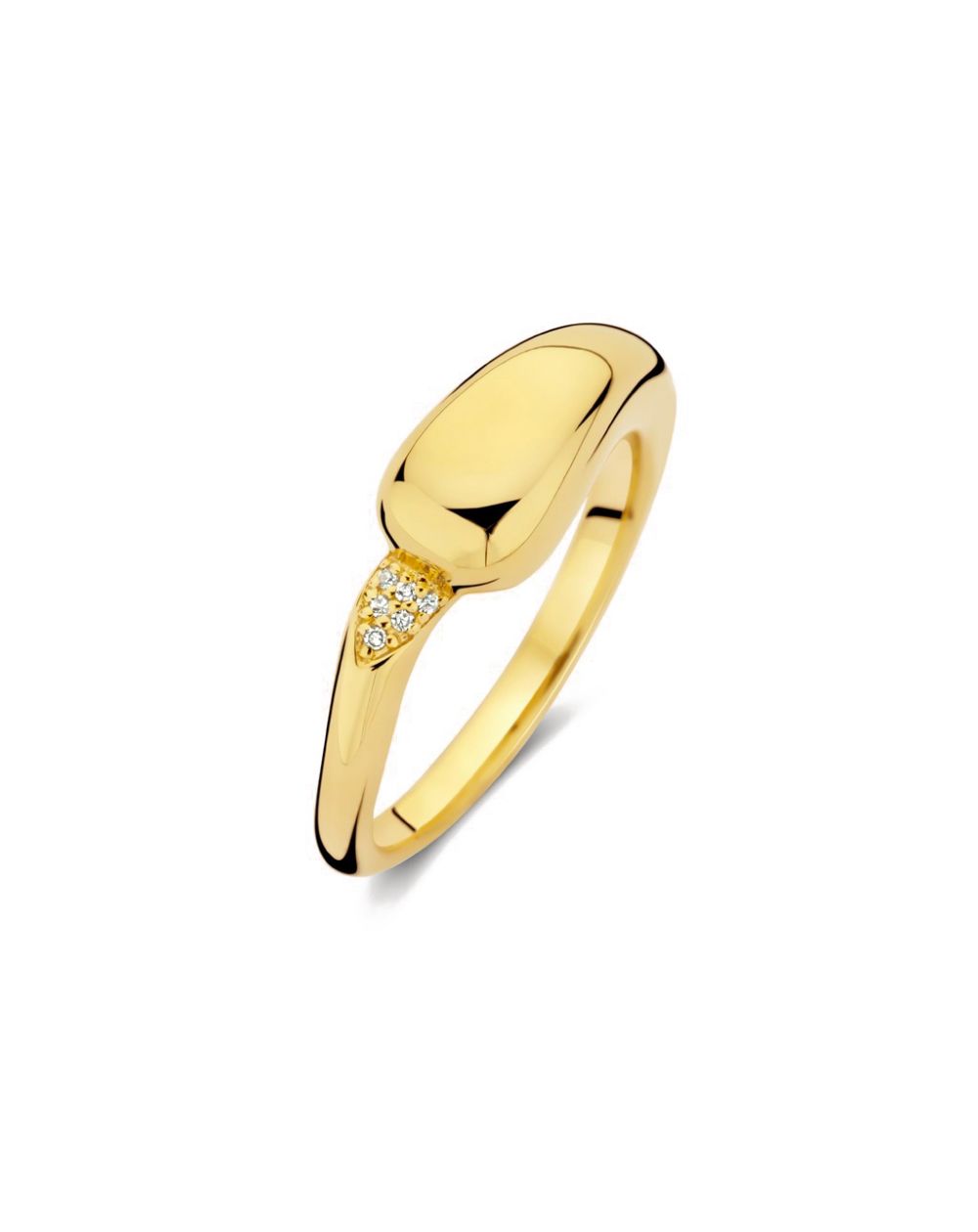 De ring is bezet met zes natuurlijke witte diamanten, die een vleugje schittering en verfijning toevoegen. Deze diamanten, zorgvuldig gekozen en met de hand ingelegd, vangen en reflecteren het licht, waardoor een glinsterend effect ontstaat dat doet denken aan de zoetheid en vloeibaarheid van honing.