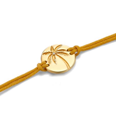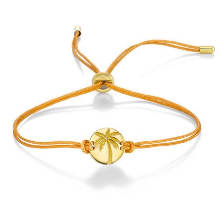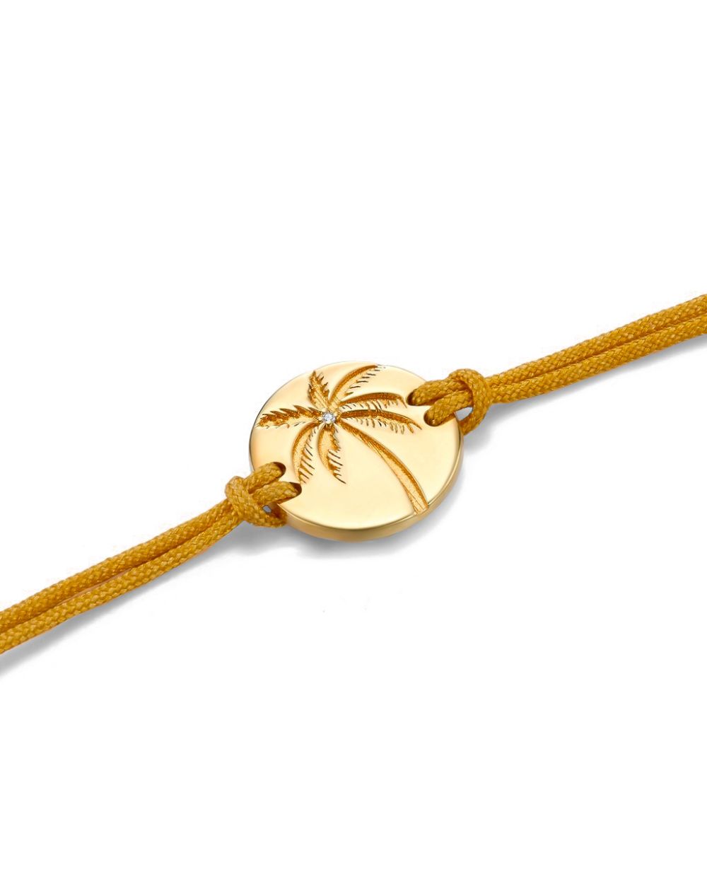 Een mosterd-okerkleurige touwarmband uit de hemel, versierd met een levendige 18-karaats geelgouden ronde bedel. Deze armband is voorzien van een gedetailleerde gravure van een palmboom, aangevuld met een oogverblindende natuurlijke witte diamant in het hart, en straalt een exotische allure uit. Met vijf andere "wraplets" beschikbaar, kun je een unieke set creëren of deze delen met je vrienden als symbool van eeuwige vriendschap.
