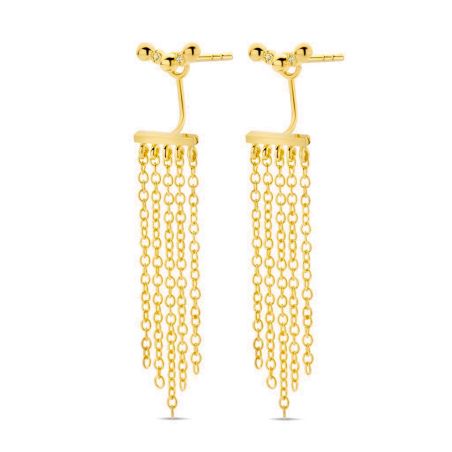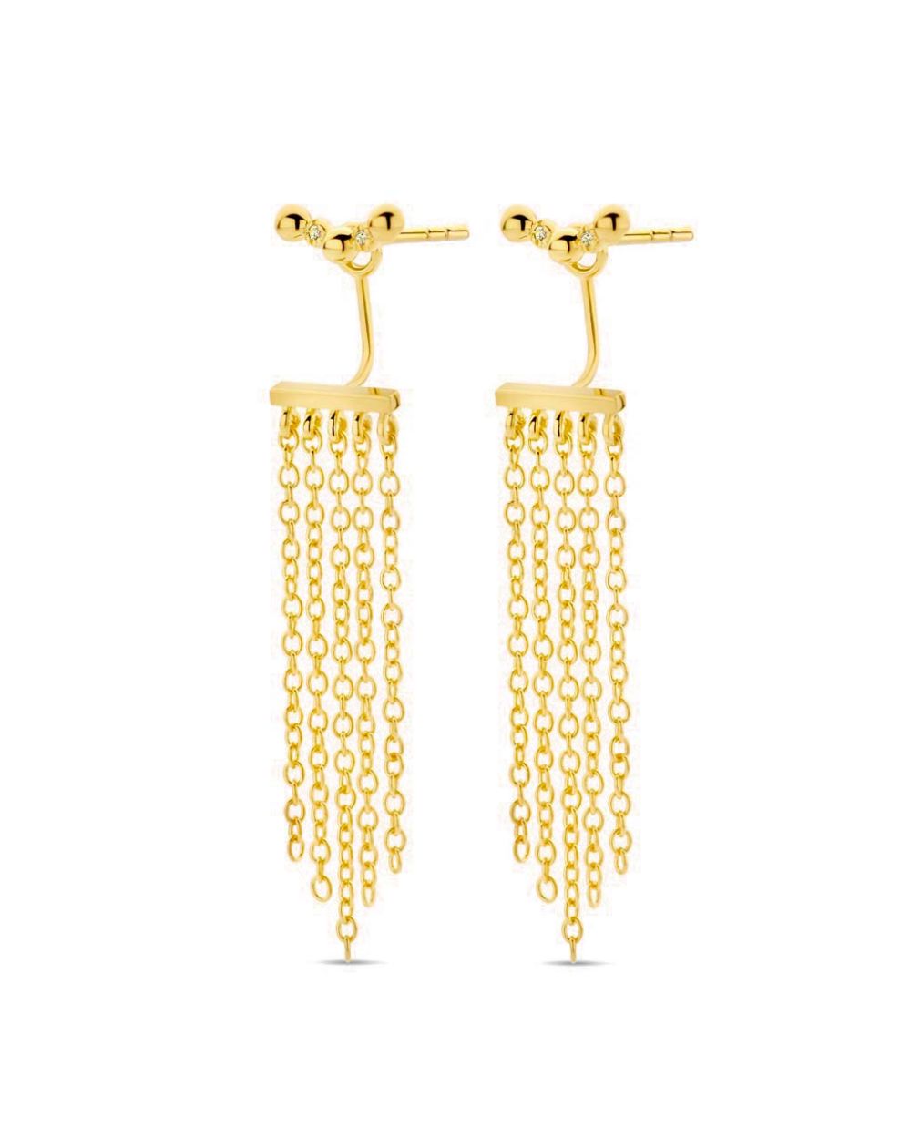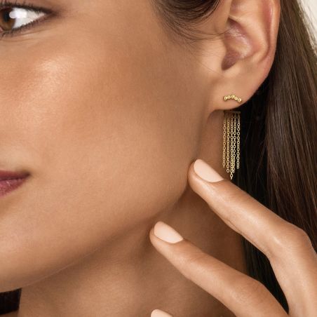 Een delicate gebogen oorknopje bezet met vier diamanten (4x), verfraaid met een waterval van kettingen – geïnspireerd door de zachtheid van een licht briesje en golven die zachtjes op de kust neerstorten.
