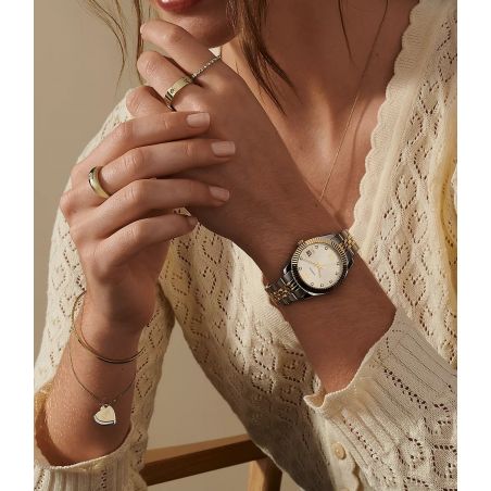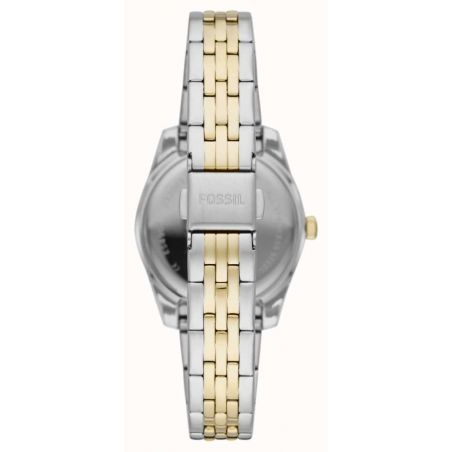 Dit Fossil Scarlette Mini-horloge van 32 mm heeft een goudkleurige sunburst-wijzerplaat, een uurwerk met drie wijzers met datum en een tweekleurige zilveren en goudkleurige roestvrijstalen armband.