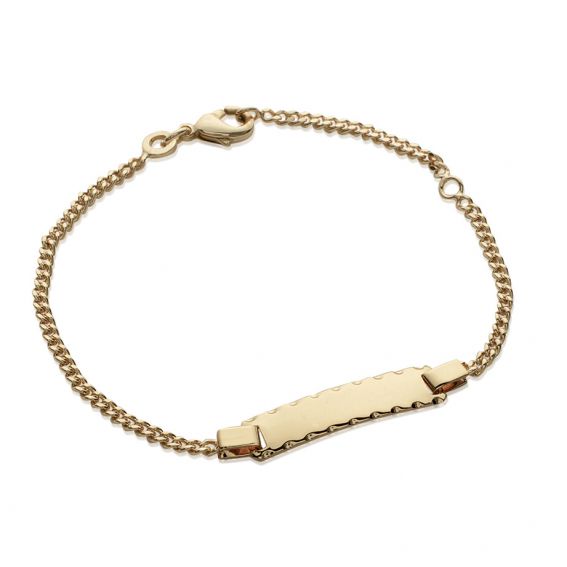 Deze hoog kwaliteit 18 karaat vergulde matricule is een armband met een kleine brochure die kan worden gegraveerd met 2 zijden van een voornaam en een datum. De lengte van de armband is 16 cm en is verstelbaar in lengte (14 of 16 cm).