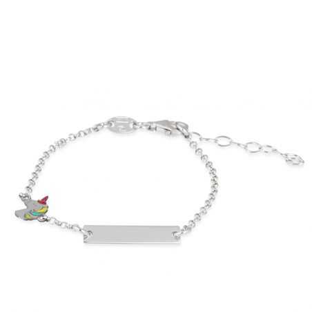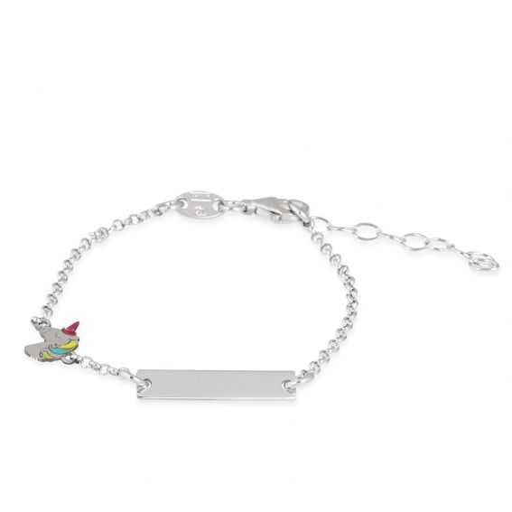 Dit 925 zilveren nummer is een armband met een klein plaatje dat aan beide zijden gegraveerd kan worden met een voornaam en een datum, evenals een geëmailleerde eenhoorn. De lengte van de armband is 16cm en is in lengte verstelbaar (14 of 16cm).