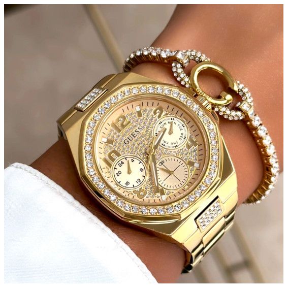 Maak een statement met dit ultra-glamoureuze GUESS horloge, voorzien van een goudkleurige stalen band versierd met sprankelende strass-details. De multifunctionele gouden wijzerplaat, voorzien van een met kristal bezette omtrek, combineert verfijning en functionaliteit in een uitgesproken chique stijl.