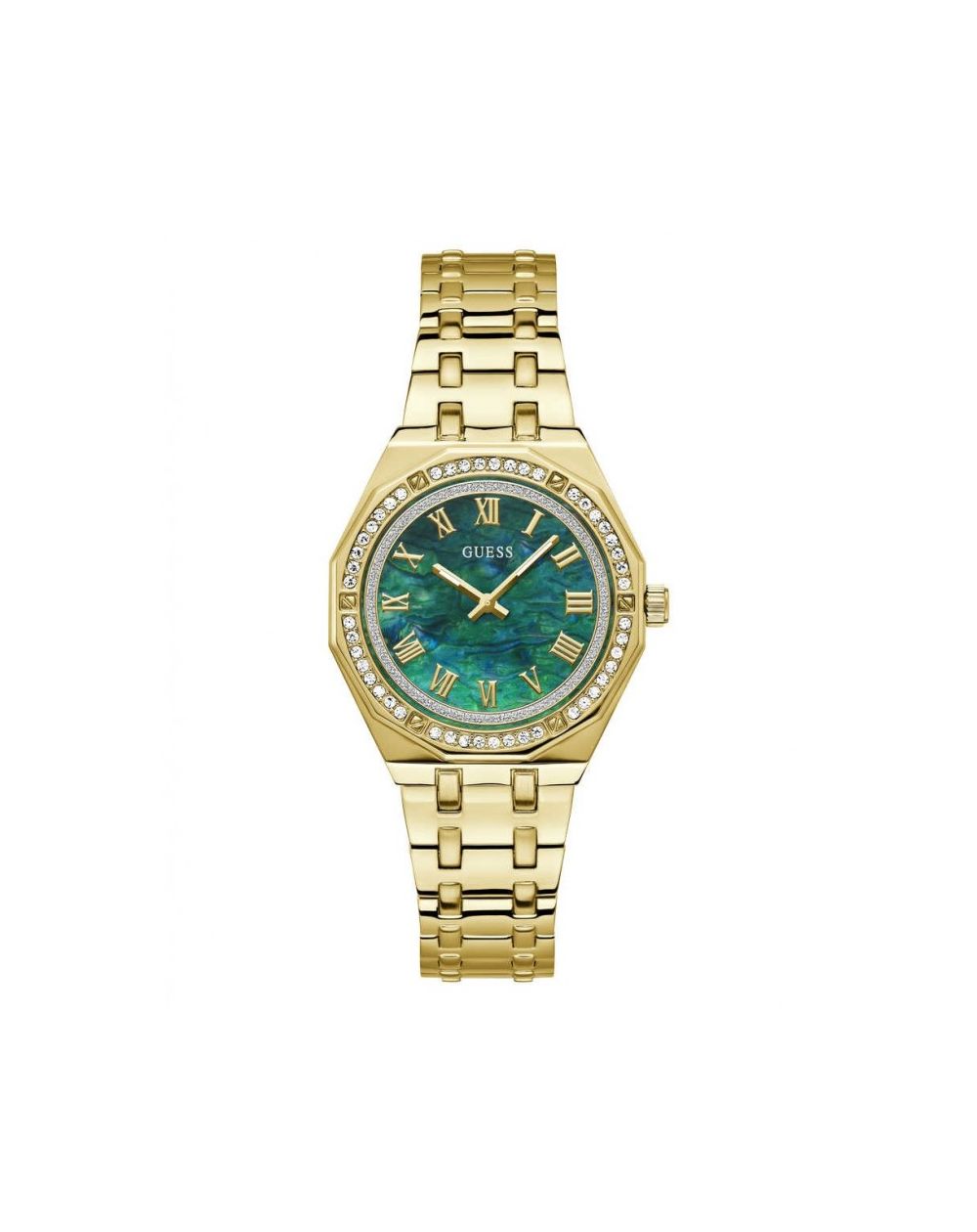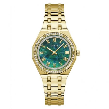 De Guess Desire is oogverblindend en assertief en belichaamt moderne elegantie met zijn unieke achthoekige ontwerp. De goudkleurige roestvrijstalen band combineert perfect met een groene parelmoeren wijzerplaat met veranderende en hypnotiserende reflecties, voor een gedurfde en verfijnde stijl.