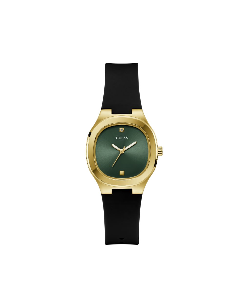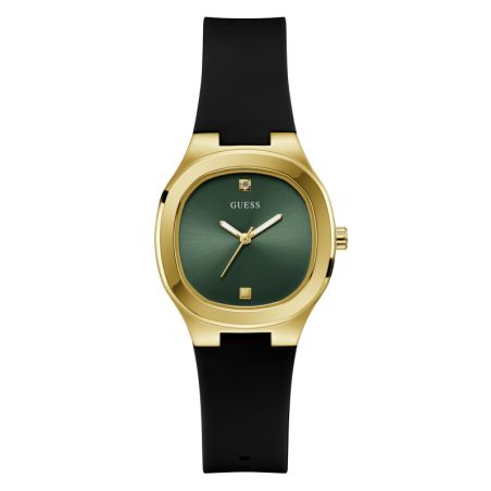 Combineer eigentijdse elegantie en een sterk karakter met de Guess Eve, een vrouwelijk horloge met een strak, geometrisch design. De glanzende gouden kast omlijst een diepgroene wijzerplaat met een zonnestraleneffect, versterkt door twee strass-indexen voor een subtiel vleugje licht.