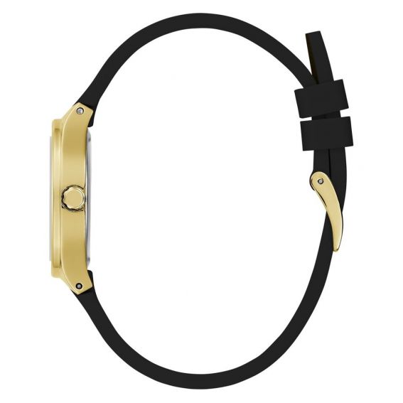 De zwarte siliconen band contrasteert harmonieus met het goud van de kast en biedt modern comfort, terwijl het tegelijkertijd een minimalistische stijl benadrukt. Een ideaal horloge voor een stedelijke, verfijnde en trendy look.