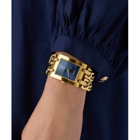 Met zijn rechthoekige gouden kast van 28 mm maakt dit horloge indruk met zijn moderne en strakke lijnen. De blauwe wijzerplaat met zonnestralenpatroon zorgt voor een diep en helder contrast en geeft het horloge een chique en verfijnde uitstraling.