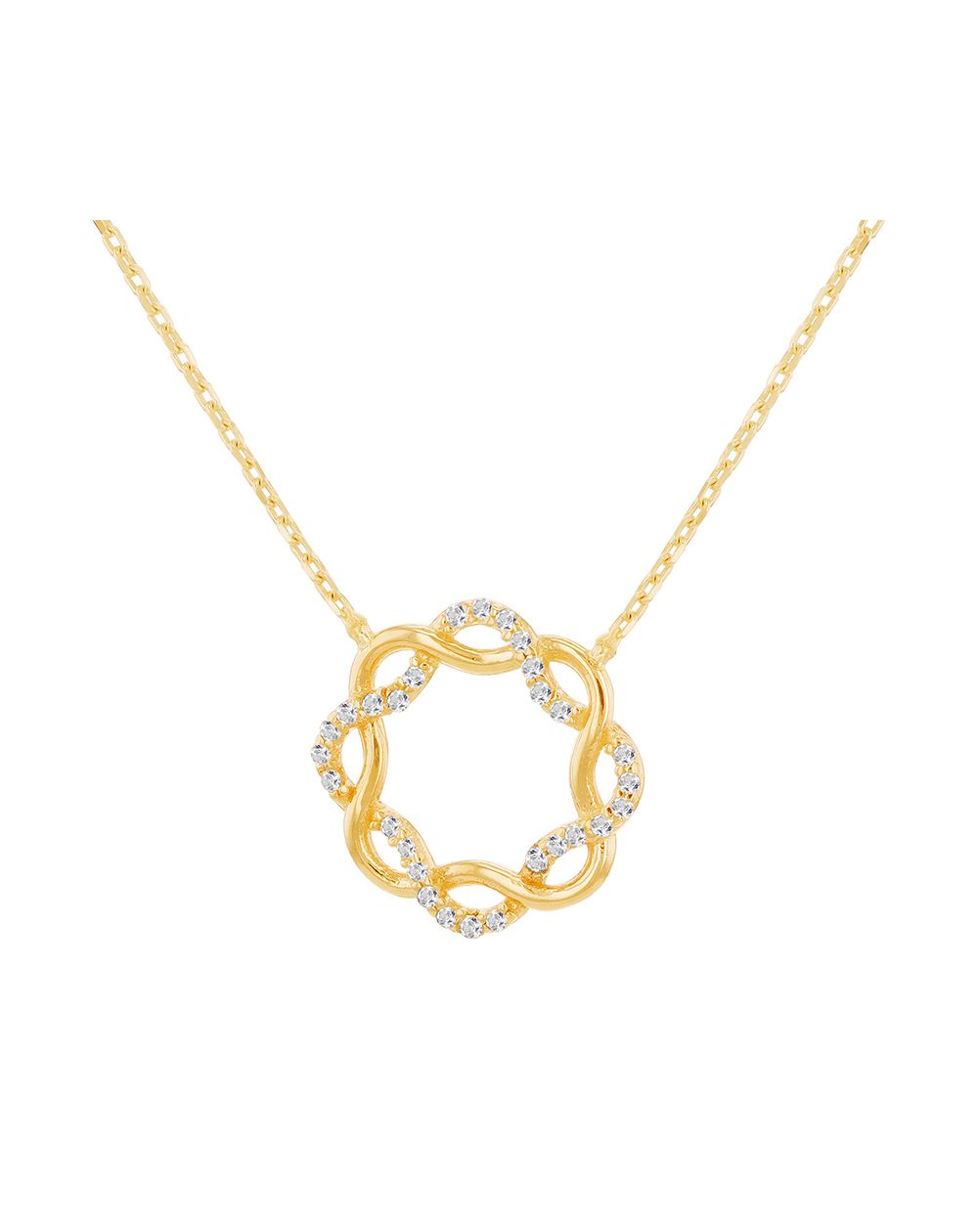 Deze Aura-ketting van 9 karaat geelgoud is een gouden damesketting met een in elkaar verweven cirkel bezet met 28 zirkoniumoxidestenen. Deze verweven cirkel heeft een diameter van 12 mm.