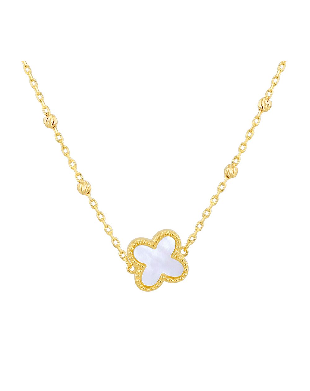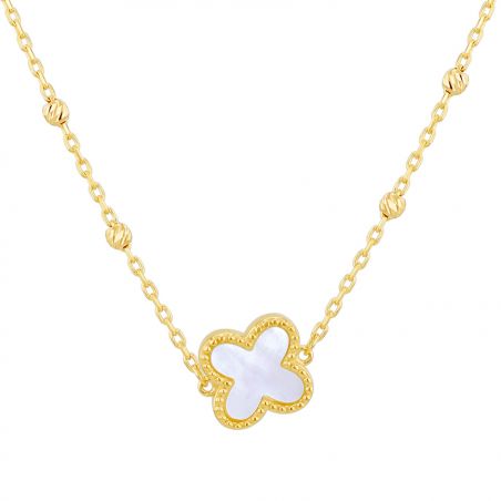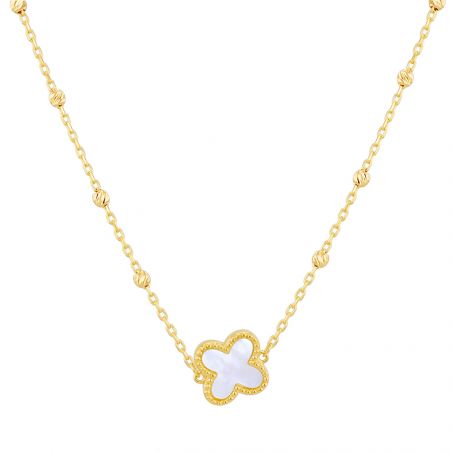 Deze gouden klavertjesketting met parelblaadjes is een 9 karaats geelgouden ketting voor dames met een klavertje met pareleffect en een diameter van 9,5 mm.