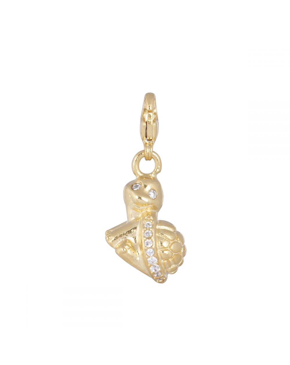 Deze gouden schildpadvormige hanger is een zilveren hanger bezet met zirkoniumoxide stenen. Deze hanger is hol, is 15 mm hoog en opent/sluit met een kleine karabijnhaak.