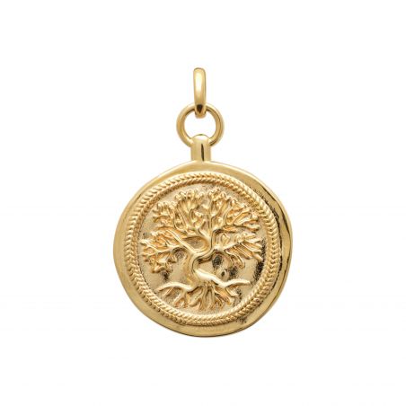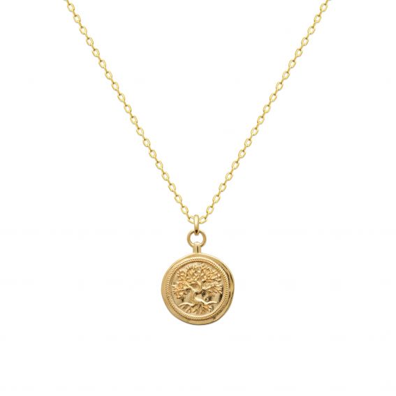 Deze gouden hanger is voorzien van een gedetailleerd motief van de levensboom, symbool voor groei, kracht en verbinding. Het cirkelvormige stuk is fijn uitgesneden en toont rijk gedetailleerde takken en wortels omgeven door een gestructureerde rand. Het ontwerp is klassiek en tijdloos, waardoor deze hanger een elegante keuze is om elke sieradencollectie te verrijken.