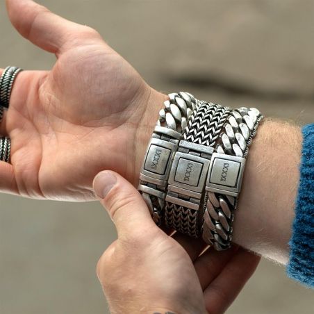Deze armband van het merk iXXXi is een roestvrijstalen armband met een platte schakel die in een rij is gevlochten, twee schakels breed met reliëf aan beide zijden.