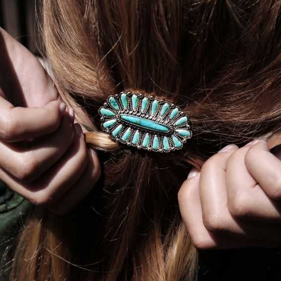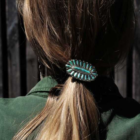 Dit Hipanema elastiek is een zwart haarelastiek met een zilveren cabochon in het midden, geïnspireerd op de Zuni-stammen. We houden van de combinatie van druppels met turkoois effect en het geëmailleerde ornament dat een eerbetoon is aan de delicatesse van Indiaans vakmanschap.