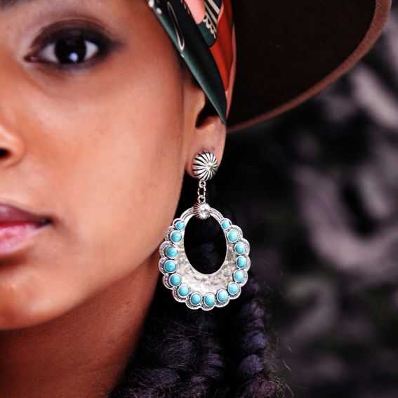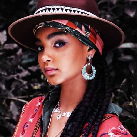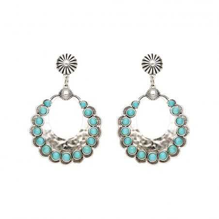 Deze Hipanema oorbellen van zilver voor oren met gaatjes, met een schelpvormige kop van de gesp, opening op een gesp in creoolse stijl, gehamerd, met een opening in het midden. Zeer gestileerd, ze zijn versierd met kleine druppels hars met turkoois effect.