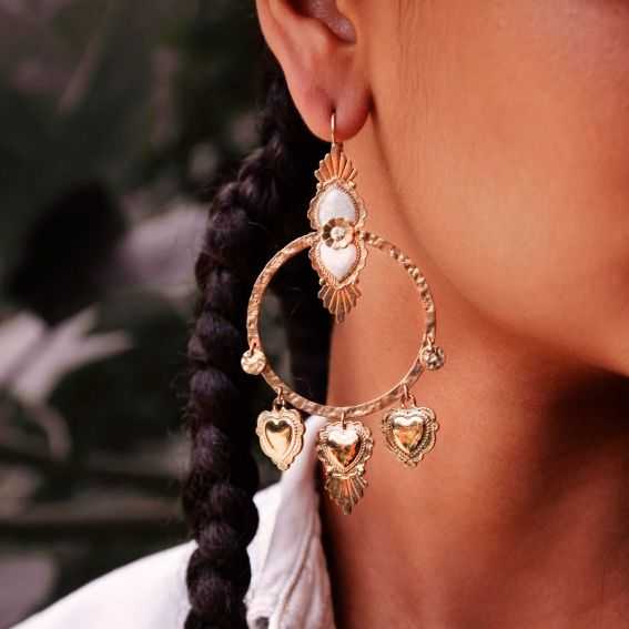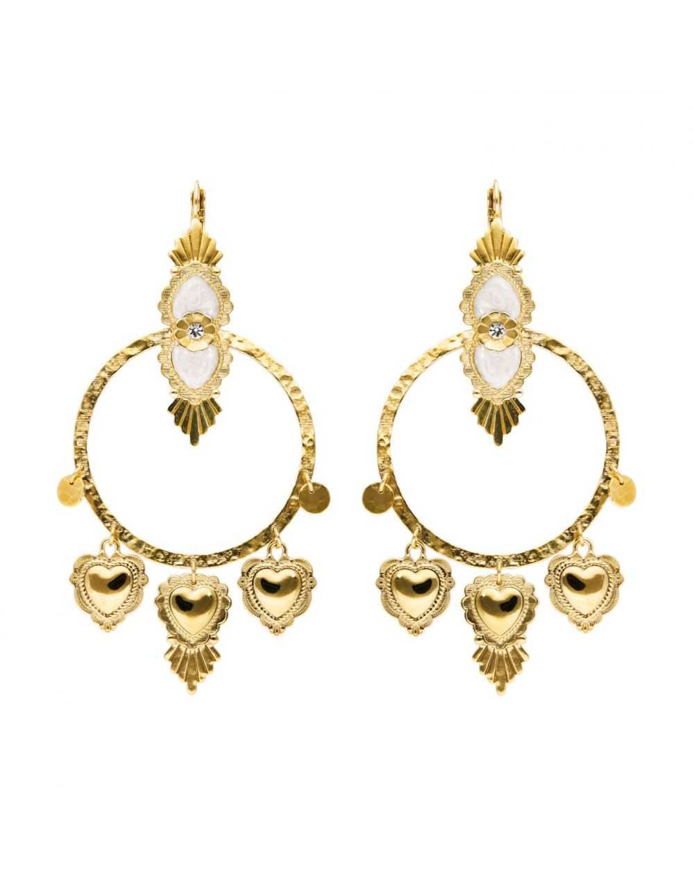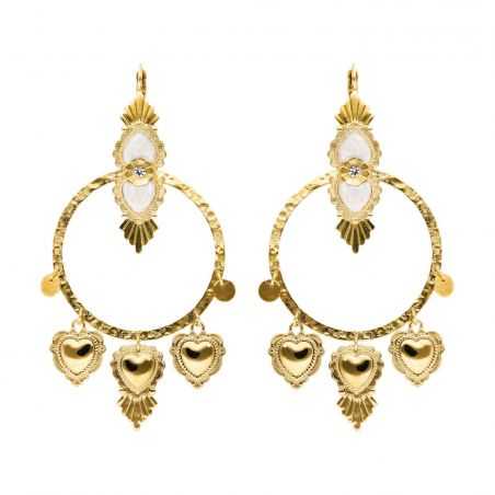 Deze oorbellen van het merk Hipanema zijn oorringen voor oorgaatjes, verguld met fijn goud, voorzien van een tussenstuk. De kop van de oorbel bestaat uit twee omgekeerde harten in parelachtig hars, gehamerd, bewerkt in een barokke stijl op een Creoolse ring versierd met gouden hangers: kleine harten en pailletten van Latijns-Amerikaanse inspiratie. We houden van deze combinatie van kleuren tussen paarlemoer en goud in een New Mexico-sfeer.