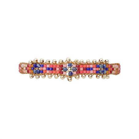 Deze Hipanema-armband is geweven, met een kostbare karabijnsluiting, verguld met fijn 18-karaats goud. In het midden is er een geweven patroon van etnische inspiratie waar Miyuki-parels zich vermengen, in variaties van Klein Blue, roze, oranjerode zeebamboe, met halfedelstenen gefacetteerde parels in hematiet, lapis lazuli, oranje granaat, evenals microscopische parels aan het einde van de armband. Hipanema innoveert hier met een zeer elegant en origineel weefsel voor deze handgemaakte armband.
