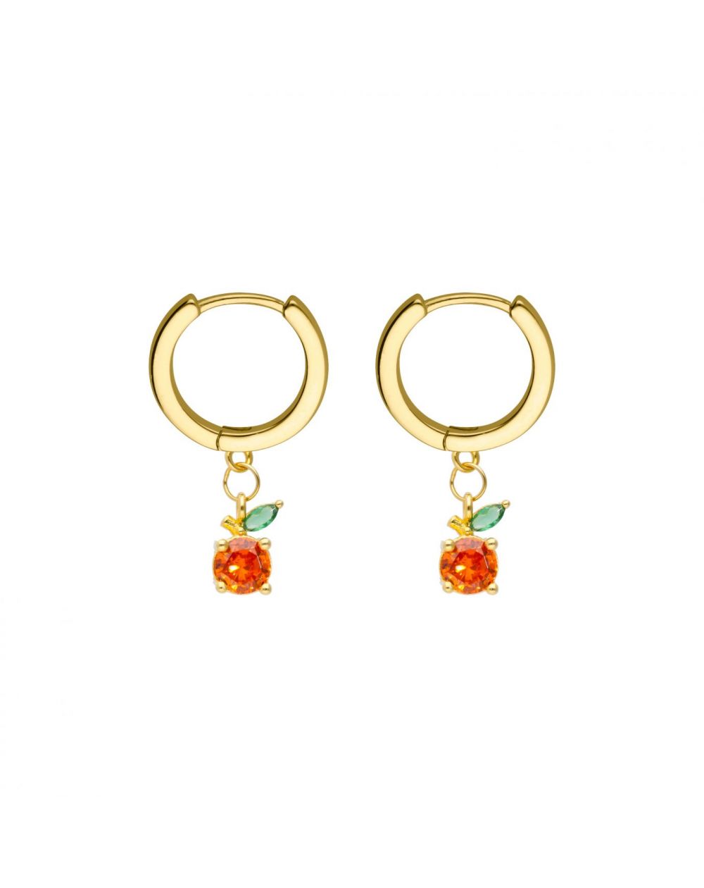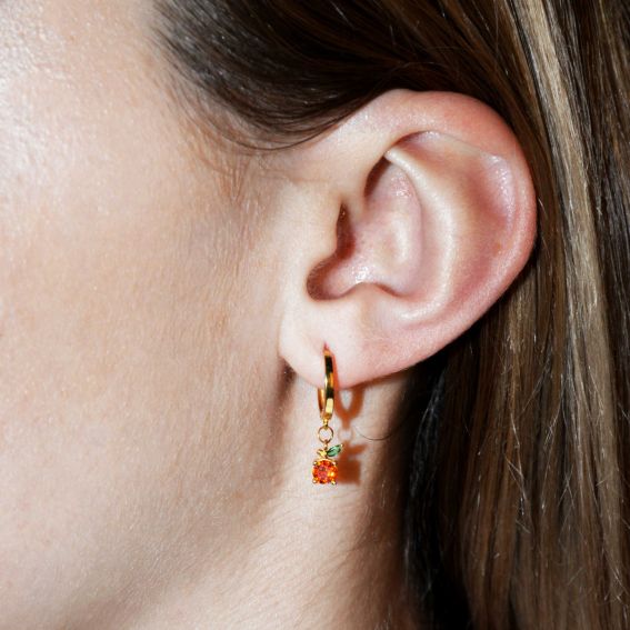 Oorbellen van het merk Hipanema, mooie kleine ringetjes verguld met fijn 18 karaats goud op echt 925 zilver. Dit vermeil juweel is gegarandeerd zonder risico op allergie. Ze zijn versierd met kleine perziken in oranje en smaragdgroene strass-steentjes.