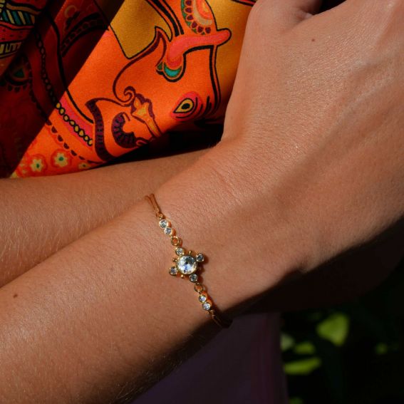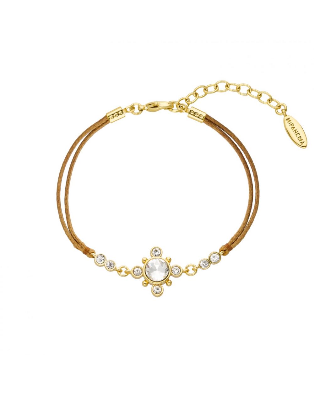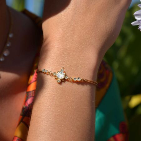 Deze Hipanema-armband is een kleine armband gemonteerd op een kameelkoord, sluiting verguld met fijn 14-karaats goud, met een cabochon van strass met diamanteffect omgeven door kleine bijpassende strass-steentjes met edelsteeneffect. Dit juweel, handgemaakt, kan alleen of in combinatie worden gedragen. Een echt snoepje voor de zomer!