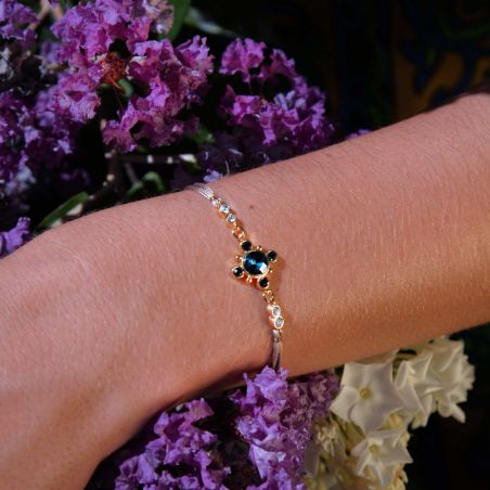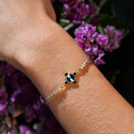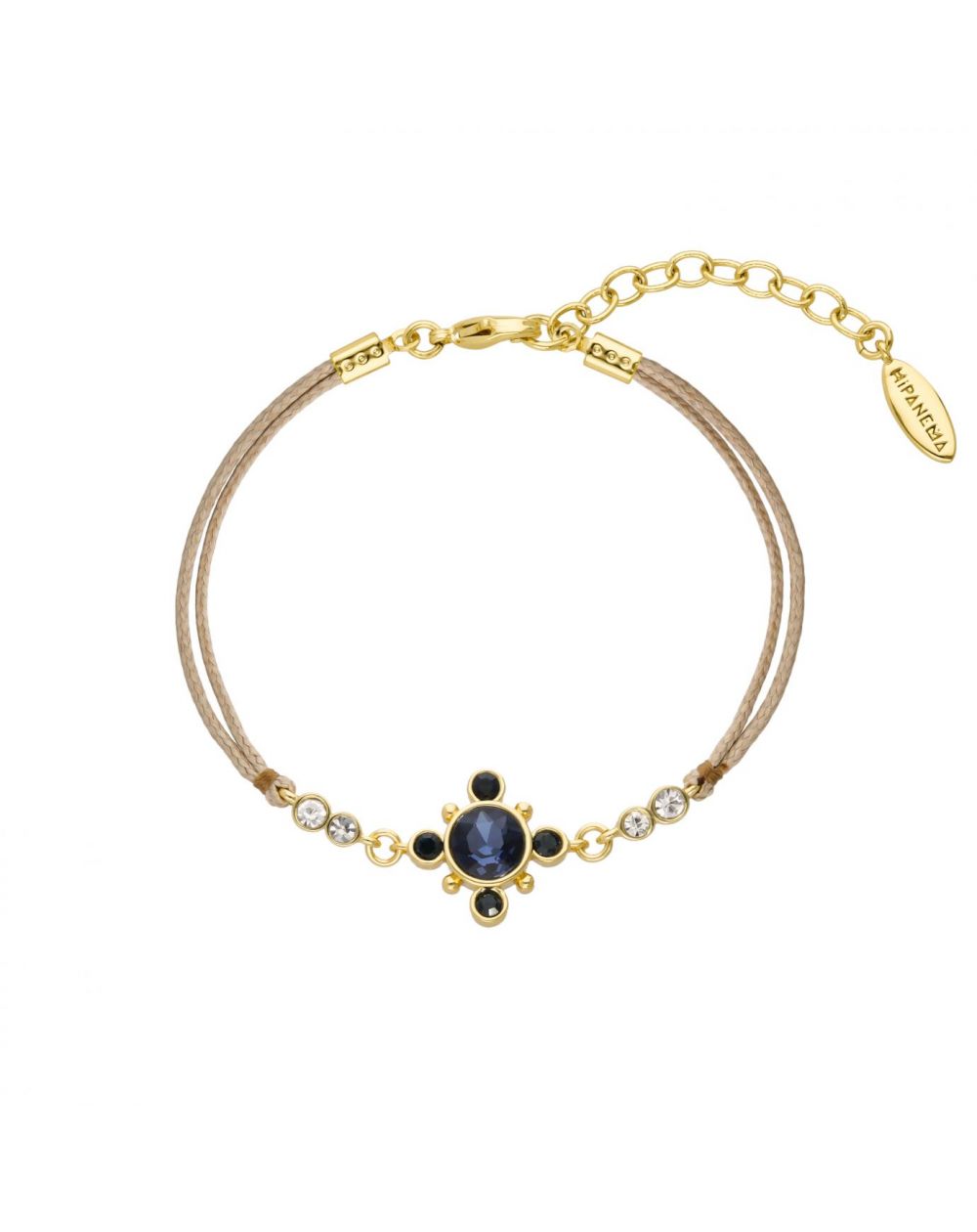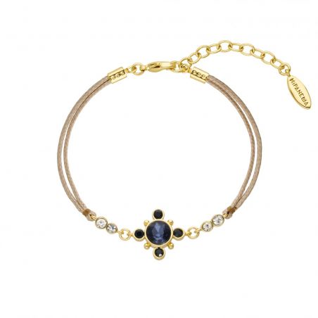 Deze Hipanema-armband is een kleine armband gemonteerd op een lichtgrijs koord, sluiting verguld met fijn 14-karaats goud, met een blauwe saffier-effect cabochon omgeven door kleine bijpassende edelsteen-effect strassteentjes. Dit juweel, handgemaakt, kan alleen of in combinatie worden gedragen. Een echt snoepje voor de zomer!