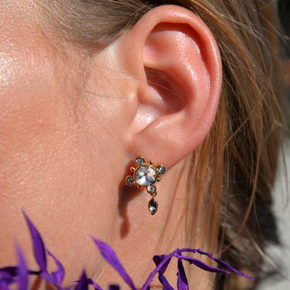 Oorbellen van het merk Hipanema zijn 14 karaat fijn goud vergulde oorbellen, met een oorsteker voor gaatjes in de oren. Het centrale element is samengesteld uit een pluche diamant-effect strass en omringd door vier kleine bijpassende strass-steentjes.