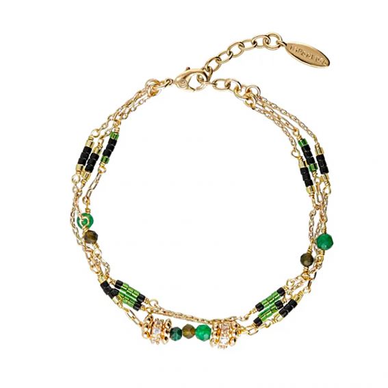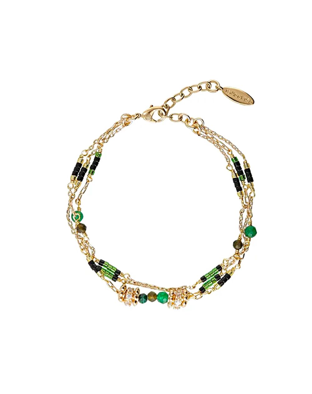 Deze Hipanema-armband is een armband verguld met fijn 18-karaats goud, gemonteerd met kleine parels in smaragdgroene en zwarte tinten.