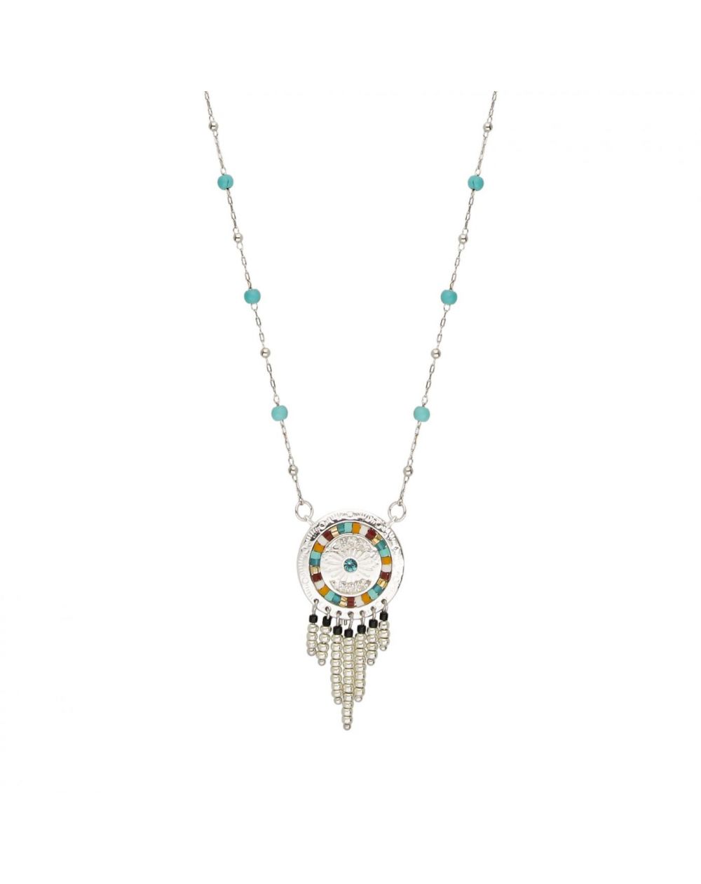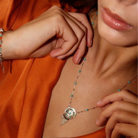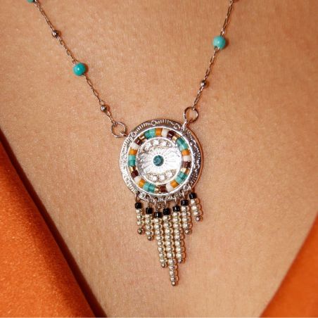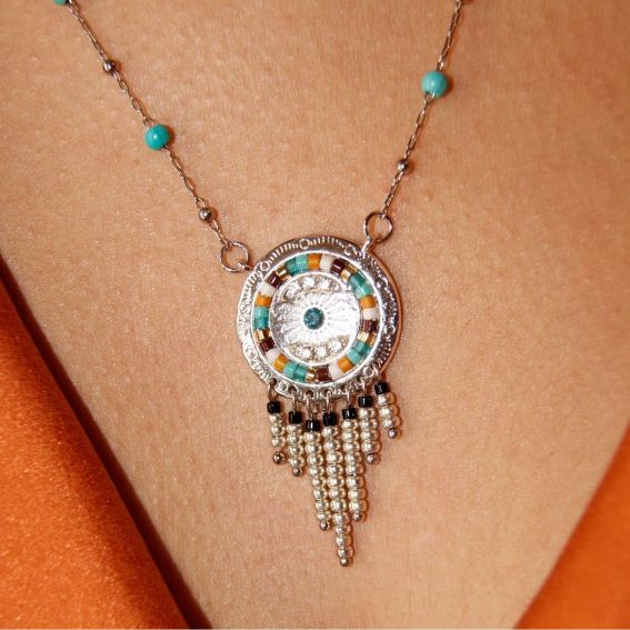 Deze halsketting van het merk Hipanema is een verzilverde rozenkransketting met turkoois effect. Er is een elegant veelkleurig zonneschijfmedaillon, handgemaakt in karamel- en turkooizen tinten, versierd met kleine strass-steentjes en in het midden versierd met een hemelsblauwe strass-steen met Aquamarijn-effect. We houden van het detail van de kleine cascade van parels in een goud en zwart kleurverloop, die zijn vreugdevolle en positieve energie doordringt.
