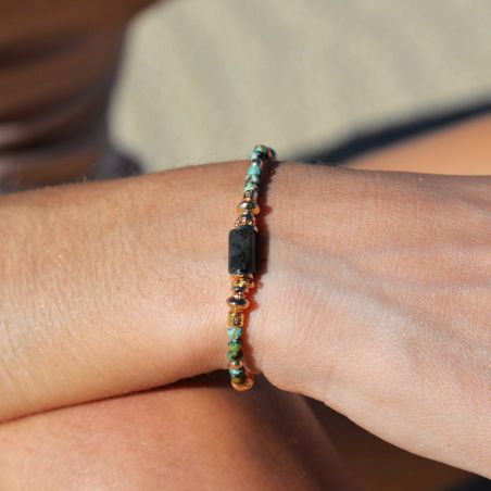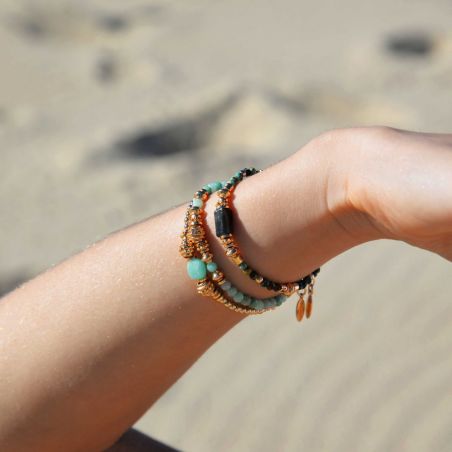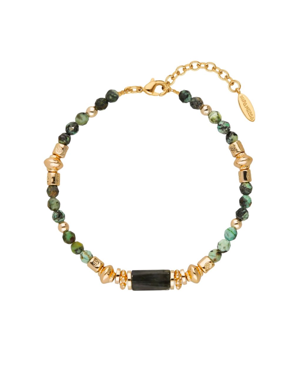 Deze Hipanema-armband is een mooie armband verguld met fijn 18-karaats goud, samengesteld uit halfedelstenen in turkoois, versierd met een labradoriet in het midden. Vier partijen in gouden ringen brengen ritme in de compositie. De originele en onmisbare armband, om alleen of samen te dragen.Dit juweel met luchtige verfijning is handgemaakt.