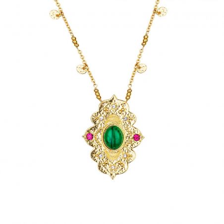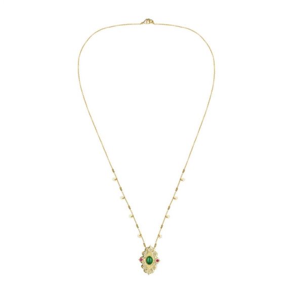 Byzantijnse inspiratie voor onze Bayou-ketting, van gemiddelde lengte aan een kabelketting met aan weerszijden kleine kwastjes. In het midden een sierlijk element voor een zeer Byzantijns effect, versierd met een centrale parel van hars in groene malachietstijl.