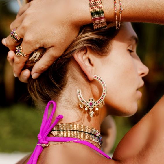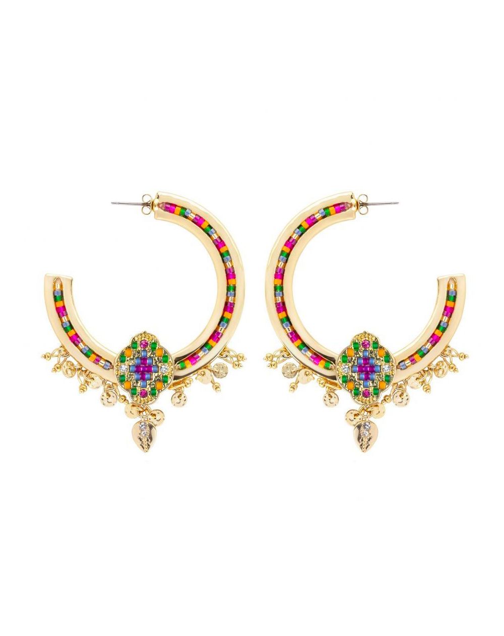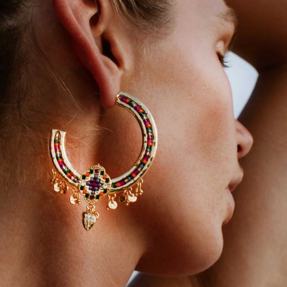 Deze hipanema merk Zewel Gold oorringen zijn genereus en verguld met fijn goud. Ze zijn volledig vervaardigd met in het midden een cabochon met een geometrisch patroon van rocailles in groene en fuchsia tinten, versierd met rocailles over de hele halve cirkel. Wij houden van de oriëntaals geïnspireerde toets van de kleine gouden kwastjes.