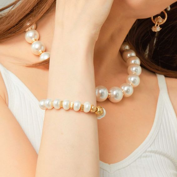 Hipanema armband van echte kweekparels, onregelmatig voor een zeer vintage look, afgewisseld met gouden ronde kralen.