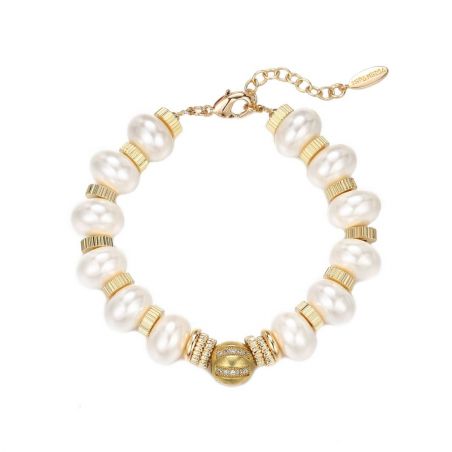 In het midden vinden we een ritme van gestreepte gouden rondelkralen, geplaveid met strass-steentjes, met een centrale strass-bol, altijd in deze chique sfeer. Aanpasbaar aan alle maten dankzij de verlengketting.