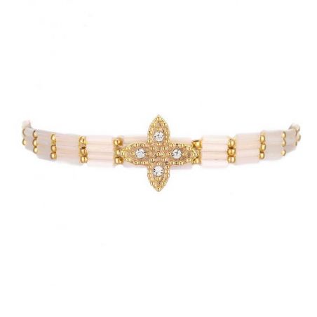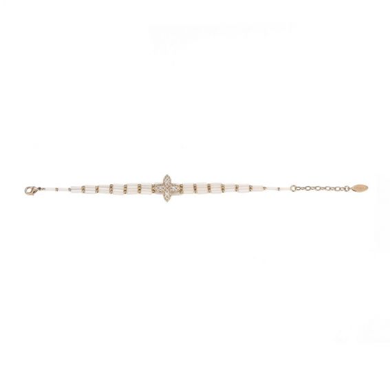 Armband verguld met fijn 14-karaats goud, in het midden versierd met een iets langwerpig klavertje vier, geplaveid met sierlijke strass-steentjes. Het is gemonteerd op een armband van parelachtige buiskralen met schelpeffect, met een ritme van kleine gouden bolkralen.