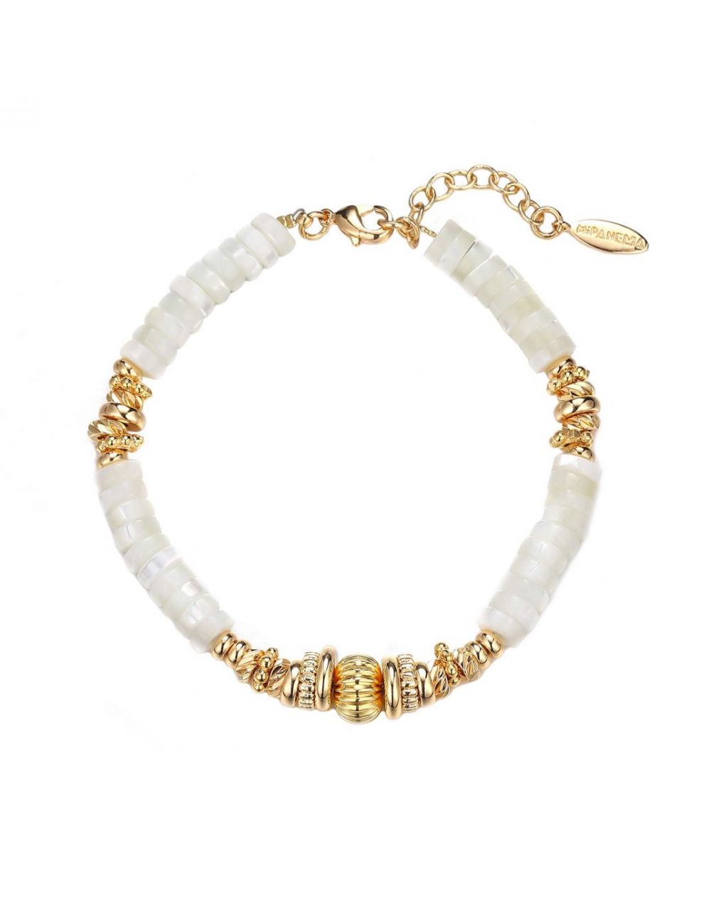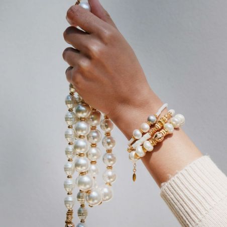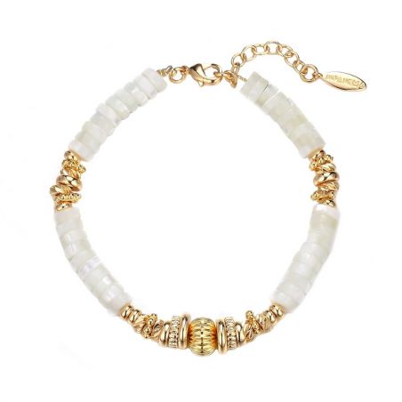 Armband van rondelkralen van parelmoer, in het midden onderbroken door een opeenstapeling van kleine gouden rondellen, gestreept en geplaveid met strass-steentjes, die verspreid over de ketting te vinden zijn. Een kostbare armband met echte parels, om tijdens de zomer te dragen.