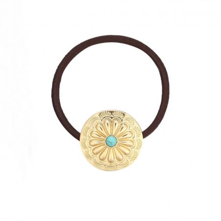 Dit zwarte elastiek heeft een ronde gouden cabochon, geïnspireerd op de Navajo-esthetiek, versierd met een madeliefje gecentreerd op een blauwe steen met turkooiseffect. Een accessoire dat zowel chic als origineel is om uw kapsels voor elke gelegenheid te verfraaien.