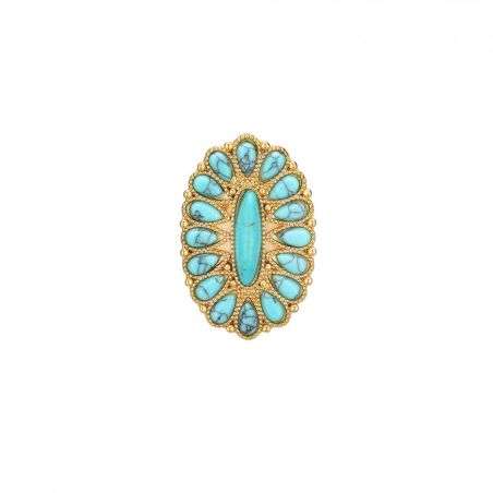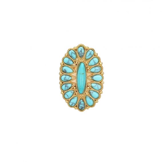 Deze imposante en fijn vervaardigde gouden ring is geïnspireerd op Zuni Navajo-motieven. Het bewerkte ovaal is bezaaid met kleine druppels hars met turkooiseffect, met een elegante bijpassende centrale steen. Het verstelbare ontwerp is geschikt voor alle maten en de ambachtelijke productie garandeert uitzonderlijke kwaliteit. Vermijd contact met water en chemicaliën. Deze ring wordt geleverd in een Hipanema-zakje en voegt een vleugje verfijning toe aan elke outfit.