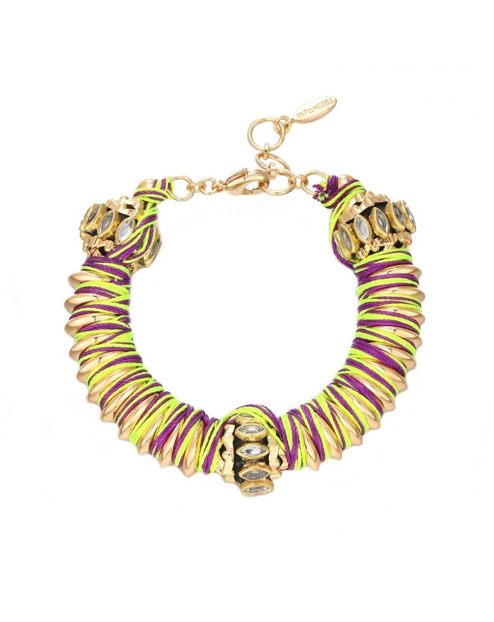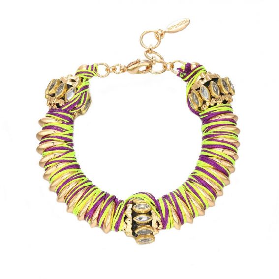 Ontdek de pracht van Bollywood met deze opvallende armband, versierd met gouden kralen verweven met neongele en paarse draden. In het midden zit een imposante cilindrische parel, zorgvuldig vervaardigd en geplaveid met lichtgevende steentjes. Dankzij de verlengarmband past hij zich perfect aan alle maten aan, waardoor een vleugje aanpasbare luxe aan je outfit wordt toegevoegd.