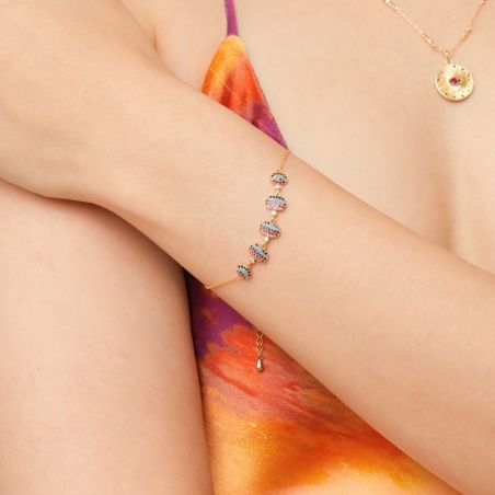 Vier de zomer in stijl met onze fijne vergulde Hipanema-armband. Dit essentiële sieraad heeft vijf glinsterende cabochons in boeiende gradiëntkleuren – diamantwit, robijnroze, saffierblauw en turkoois – gemonteerd op een stevige kabelketting. Het kleurrijke zigeunerdesign is de perfecte touch om je zomeroutfits een vleugje glamour te geven.